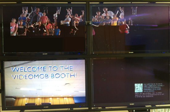 Located on the 3rd Floor of UCSD's Computer Science building, this is our most recent test of VideoMob. Users are invited through a four-screen dynamic display to "join the crowd." Using a Microsoft Kinect, the system detects the user and keys him or her out of the background using the depth camera. The collected ten second video self portrait is saved and added instantly to the constantly looping videos recorded by earlier users.