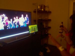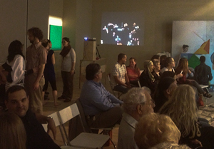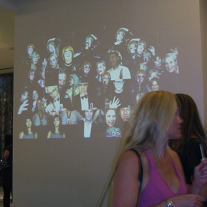 This test of the VideoMob was displayed at a party in Houston, TX. The Houston Release uses a computer monitor and Kinect to interact with participants and a large display screen to show the generated crowd.